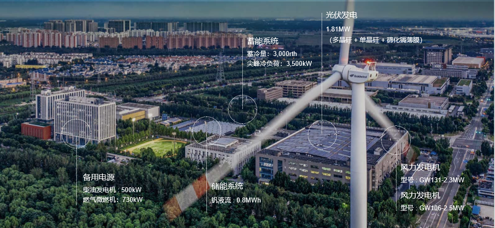 金風(fēng)科技北京亦莊“碳中和”智慧園區(qū)是公司探索實(shí)踐“源網(wǎng)荷儲一體化”、 “風(fēng)光水火儲一體化”,通過節(jié)能減碳、新能源減碳、交易減碳及α能源聚合平臺,構(gòu)建面向新型電力系統(tǒng)零碳解決方案的典型案例。園區(qū)充分融合分散式風(fēng)電、分布式光伏和釩液流、鋰電池、超級電容等多種新能源形式,結(jié)合運(yùn)營體系,有效提升園區(qū)能源綜合利用效率,同時大幅度減少園區(qū)碳排放量與電力使用成本。