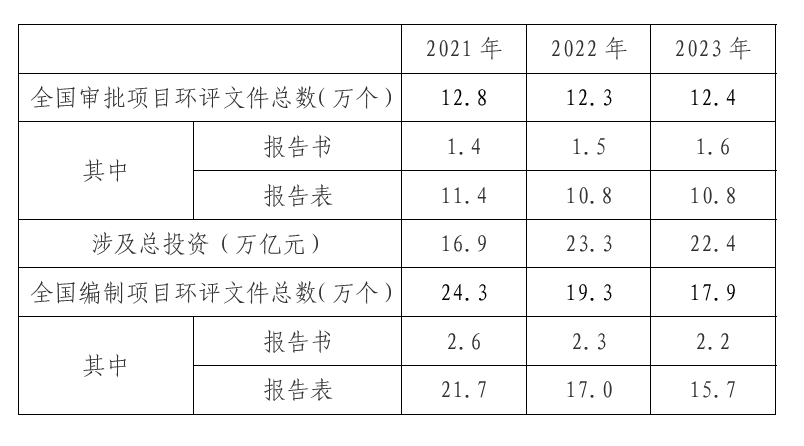 (1)環(huán)評文件審批2023年全國共審批項目環(huán)評文件12.4萬個,同前兩年基本持平。近三年全國審批及編制環(huán)評文件數量情況見表1。
