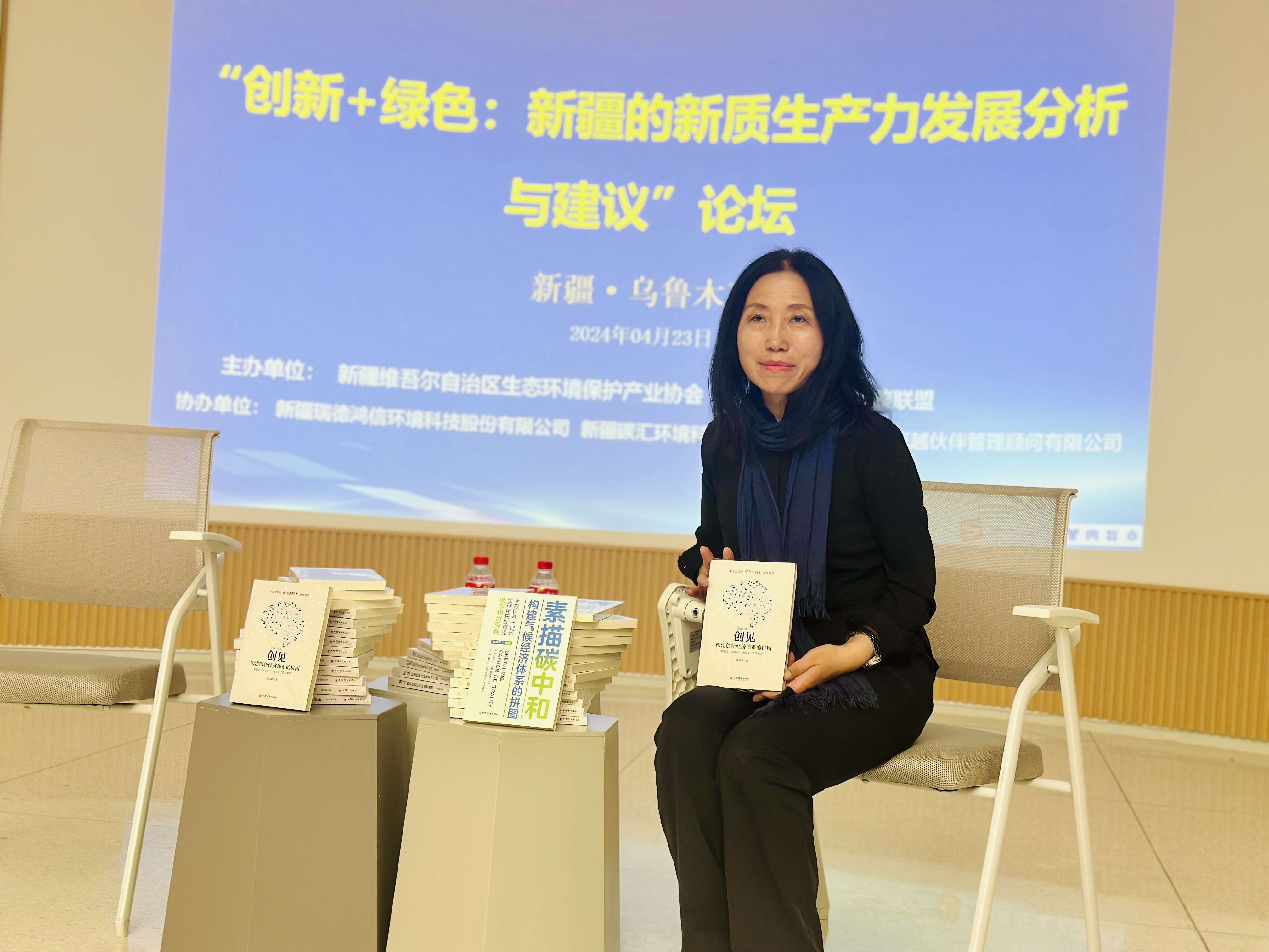 在此次論壇中,張聞素女士還從新疆所處地理環(huán)境、地理優(yōu)勢(shì)、產(chǎn)業(yè)優(yōu)勢(shì)等深入探討解析了新疆在創(chuàng)新與綠色發(fā)展方面的最新動(dòng)態(tài)和前景。同時(shí)還和與會(huì)嘉賓分享了由她本人編寫(xiě)的《素描碳中和》及《創(chuàng)見(jiàn)》兩本書(shū)籍,并圍繞《素描碳中和》中的故事,就“新疆的新質(zhì)生產(chǎn)力發(fā)展分析與建議”相關(guān)議題展開(kāi)對(duì)話交流。