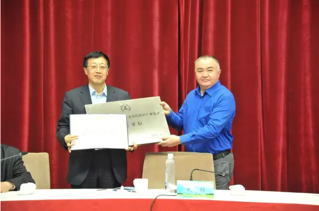 自治區(qū)環(huán)保廳黨組成員、副廳長拜合提亞·達吾提為協(xié)會會長——新能源集團董事長武鋼頒發(fā)了銘牌及證書