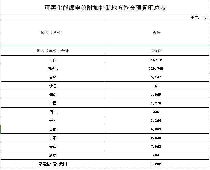近日,財(cái)政部發(fā)布關(guān)于提前下達(dá)2025年可再生能源電價(jià)附加補(bǔ)助地方資金預(yù)算的通知。根據(jù)通知,可再生能源電價(jià)附加補(bǔ)助地方資金預(yù)算地方合計(jì)378400萬元。詳情如下: