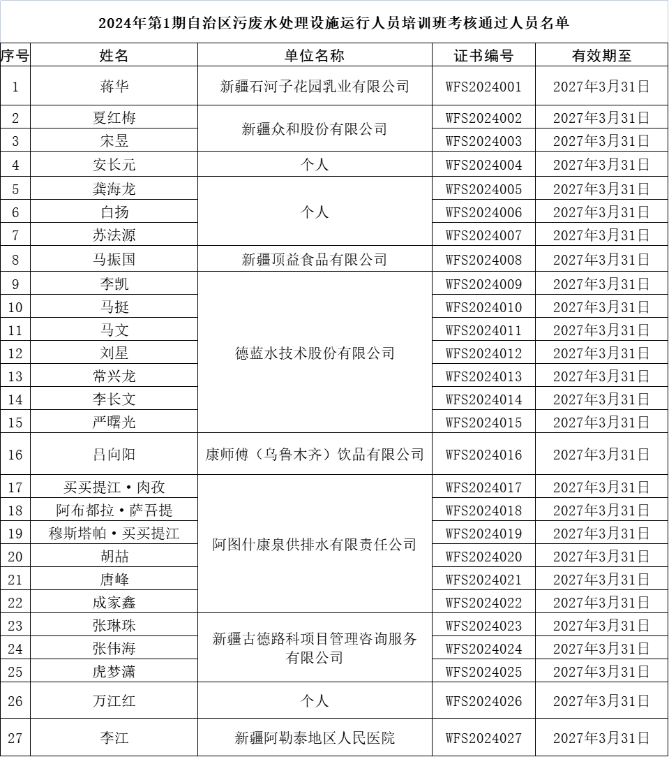 2024年第1期自治區(qū)污廢水處理設(shè)施運(yùn)行人員培訓(xùn)班考核通過名單公布
