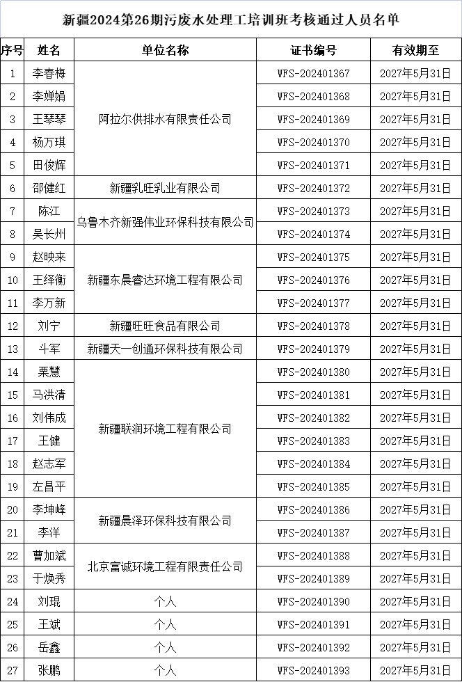 2024年第26期污廢水處理設(shè)施運(yùn)行人員培訓(xùn)班考核通過(guò)名單公布
