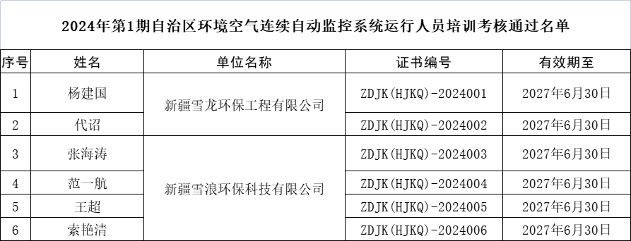 ?2024年第1期自治區(qū)環(huán)境空氣連續(xù)自動監(jiān)控系統(tǒng)運(yùn)行人員培訓(xùn)班考核通過名單公布