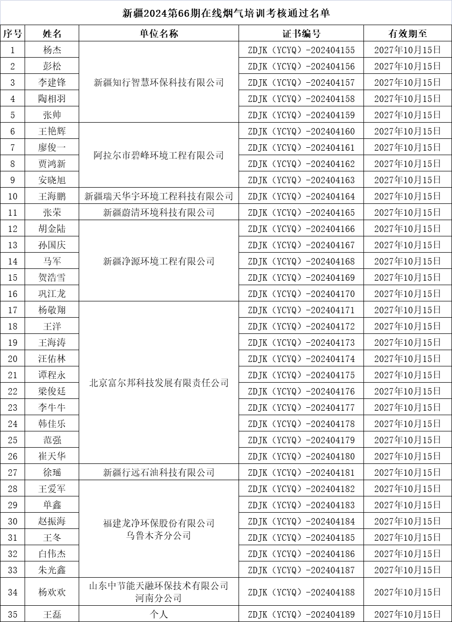 2024年第66期煙塵煙氣連續(xù)自動監(jiān)控系統(tǒng)運行人員培訓(xùn)閱卷批卷及考勤梳理工作已完成,現(xiàn)將此次培訓(xùn)考核通過名單公布如下: