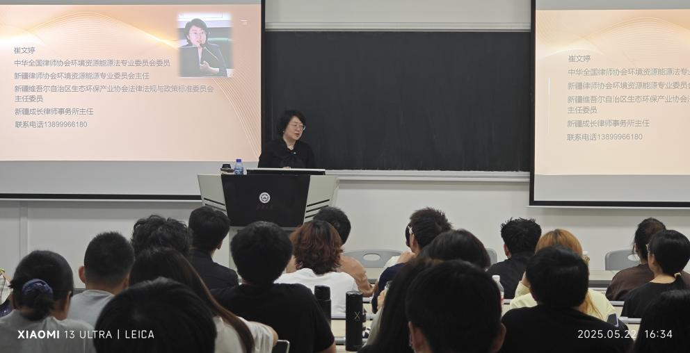 2025年5月22日下午,新疆維吾爾自治區(qū)生態(tài)環(huán)境保護產(chǎn)業(yè)協(xié)會法律法規(guī)與政策標準委員會主任委員、新疆律師協(xié)會環(huán)境資源能源專業(yè)委員會主任、新疆成長律師事務所主任崔文婷應新疆大學生態(tài)與環(huán)境學院邀請開展講座。本次講課采取線下方式,參加人員為新疆大學生態(tài)與環(huán)境學院學生。