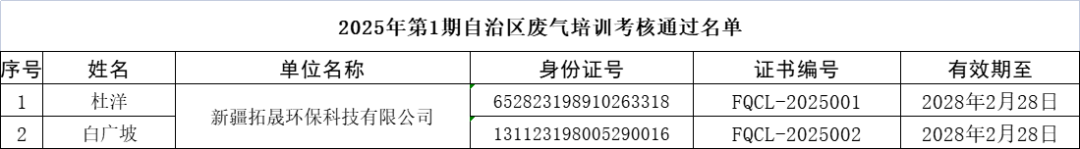 2025年第1期自治區(qū)廢氣處理設(shè)施運(yùn)行人員培訓(xùn)班考核通過名單公布