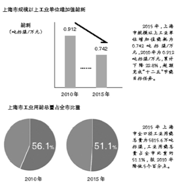 以上海為例,2015年,上海市規(guī)模以上工業(yè)單位增加值能耗為0.742噸標(biāo)煤/萬元,2010年為0.912噸標(biāo)煤/萬元,累計(jì)下降22.8%,超額完成“十二五”節(jié)能目標(biāo)任務(wù)。2015年全市全口徑工業(yè)用能總量為5815.6萬噸標(biāo)煤,工業(yè)用能總量占全市比重約51.1%,較2010年降低5個(gè)百分點(diǎn),對上海市工業(yè)綠色、可持續(xù)發(fā)展起到了積極作用。