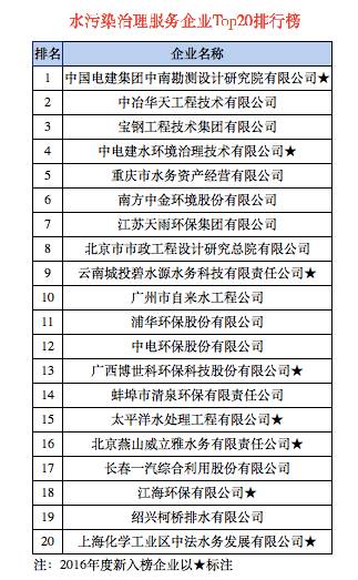 上年度水污染治理服務(wù)企業(yè)Top20中的12家繼續(xù)位列2016年度前20,8家企業(yè)新入榜。榜單前5席均為國有企業(yè)或國有獨資企業(yè)。