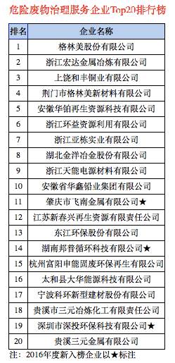2016年,危險廢物治理從業(yè)企業(yè)共計497家,同比增長10.9%,年營業(yè)收入564.9億元,同比小幅上揚7.8%,實現(xiàn)營業(yè)利潤34.4億元,同比飆升109.8% ,行業(yè)年度平均利潤率6.1%,較上年增長96.8%。危險廢物治理服務(wù)企業(yè)Top20名單如下: