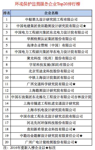 上年度環(huán)境保護監(jiān)測服務(wù)企業(yè)Top20中的15家出現(xiàn)在2016年度前20中,5家企業(yè)新入榜。國有企業(yè)與非國有企業(yè)二分天下,各占10席。