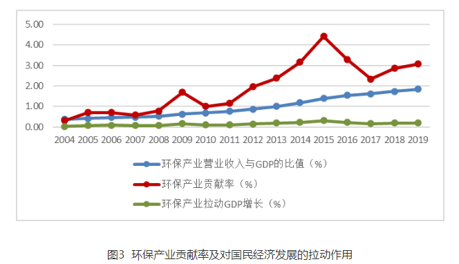 2004—2019年,我國環(huán)保產(chǎn)業(yè)營業(yè)收入與國內(nèi)生產(chǎn)總值(GDP)的比值從2004年的0.4%逐步擴大到2019年的1.8%。環(huán)保產(chǎn)業(yè)對國民經(jīng)濟直接貢獻率從2004年的0.3%上升到2019年的3.1%,盡管期間出現(xiàn)過一些波動,但環(huán)保產(chǎn)業(yè)對國民經(jīng)濟的貢獻總體呈逐步加大的趨勢。