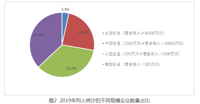 從企業(yè)規(guī)??矗腥虢y(tǒng)計范圍的環(huán)保企業(yè),大、中型企業(yè)數(shù)量占比分別為3.4%、24.3%;小、微型企業(yè)數(shù)量占比為72.2%。其中,營業(yè)收入在1億元以上的企業(yè),以9.8%的企業(yè)數(shù)量占比(較上年降低了0.6個百分點),貢獻了超過92%的營業(yè)收入和利潤。