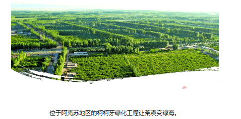 位于阿克蘇地區(qū)的柯柯牙荒漠綠化工程圍繞森林質量精準提升,提質增效,持續(xù)開展生態(tài)扶貧工作。截至目前,柯柯牙工程面積達到120多萬畝,其中荒漠綠化面積50多萬畝,周邊農(nóng)區(qū)內(nèi)建設面積70多萬畝,建成了一道寬46公里、長57公里,集多種生態(tài)林、經(jīng)濟林于一體的“綠色長城”。