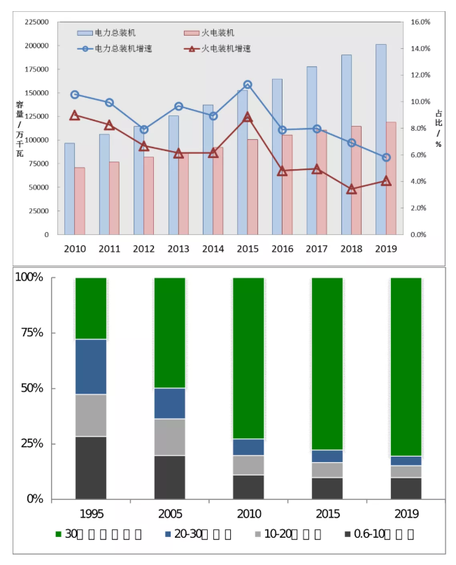 結(jié)構(gòu)調(diào)整成效明顯,資源能源利用效率逐步提升。按照相關(guān)政策要求,火電行業(yè)繼續(xù)加大結(jié)構(gòu)調(diào)整力度,提高資源能源利用效率。2019年共關(guān)停淘汰約2000萬千瓦火電小機組,30萬千瓦及以上機組裝機占比從2015年的77.8%提升至80.5%。行業(yè)平均供電煤耗從2015年的315克/千瓦時降至306.4克/千瓦時,平均發(fā)電水耗從2015年的1.40千克/千瓦時降至1.21千克/千瓦時。按全年發(fā)電量估算,行業(yè)煤炭消費量約占全國煤炭消費總量的49.8%,首次降至50%以下。