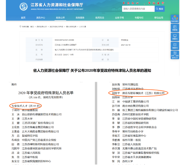 2月18日,江蘇省人社廳發(fā)布《省人力資源社會保障廳關(guān)于公布2020年享受政府特殊津貼人員名單的通知》,經(jīng)國務(wù)院批準江蘇省106位人才為2020年享受政府特殊津貼人員。經(jīng)積極推薦、層層選拔,昆岳互聯(lián)環(huán)境技術(shù)(江蘇)有限公司(簡稱:昆岳互聯(lián))董事長劉懷平入選。