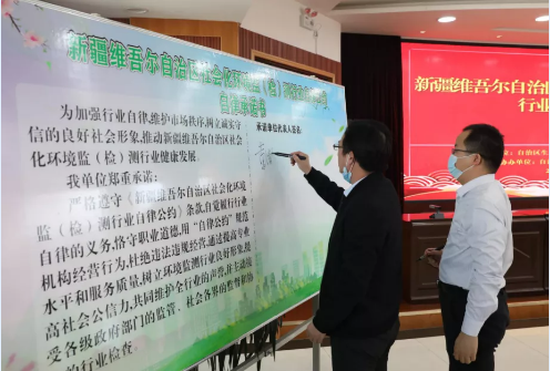 隨后,協(xié)會副秘書長賀華宣讀了《新疆維吾爾自治區(qū)社會化環(huán)境監(jiān)(檢)測行業(yè)自律公約》并由十家企業(yè)代表上臺簽訂了自律公約承諾書。會議最后一項,所有參會代表就目前行業(yè)現(xiàn)狀、企業(yè)發(fā)展存在的困難和問題等內(nèi)容進行了交流討論。