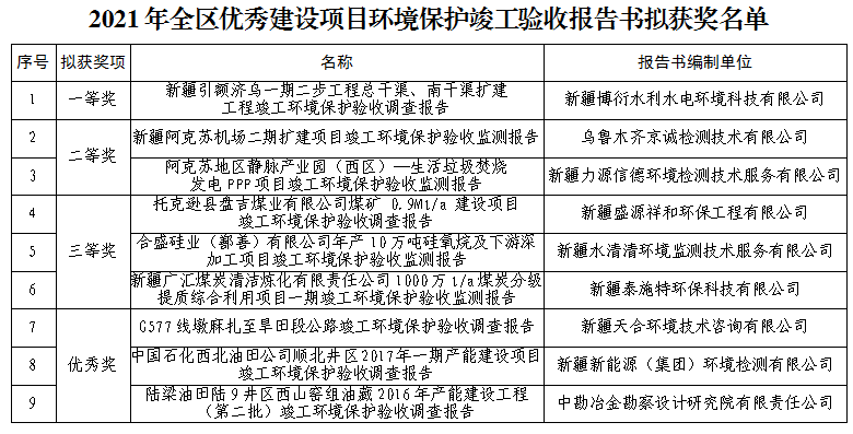 附件:2021年全區(qū)優(yōu)秀建設(shè)項(xiàng)目環(huán)境保護(hù)竣工驗(yàn)收?qǐng)?bào)告書擬獲獎(jiǎng)名單