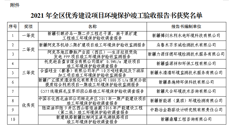 2021年全區(qū)優(yōu)秀建設項目環(huán)境保護竣工驗收報告書評選活動已圓滿結束。按照《關于開展2021年全區(qū)優(yōu)秀建設項目環(huán)境保護竣工驗收報告書評選工作的通知》(新環(huán)協(xié)發(fā)〔2021〕29號)》的要求,為秉持公平公正的原則,本次評選經過形式審查、專家評審、綜合評定、結果公示及復核環(huán)節(jié),最終確定出10本獲獎報告書,現將名單予以公布。