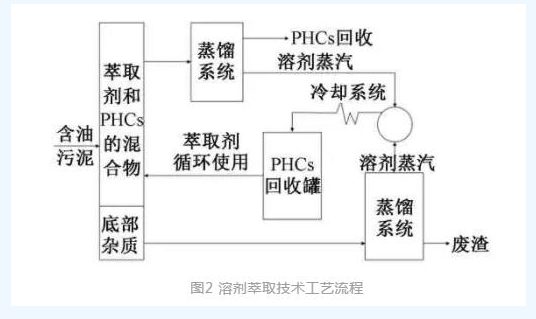 溶劑萃取法選擇一種有機(jī)溶劑作為萃取劑,利用“相似相溶”原理,將PHCs溶解并使其與含油污泥中其他組分分離,然后將混合物蒸餾以分離出PHCs和萃取劑,比離心分離法更適用于高含油率油泥、老化油泥等一些處理難度大、回收利用價(jià)值高的處理單元。
