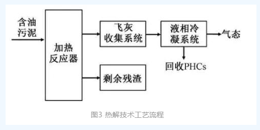 在無(wú)氧條件下,含油污泥經(jīng)高溫?zé)峤廪D(zhuǎn)化為氣、液、固三相,氣相產(chǎn)品以CH4、CO2、H2和CO為主,液相一般為常溫燃油和水,固相殘?jiān)泻薪固?,一般以回收液態(tài)PHCs為主,可不調(diào)質(zhì)達(dá)到回收目的。熱解反應(yīng)在還原氣氛下進(jìn)行,產(chǎn)二噁英極少,其典型工藝流程如圖3所示。