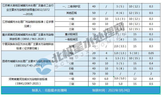 北極星水處理網(wǎng)特將全國各地城鎮(zhèn)污水處理廠水污染物排放標(biāo)準(zhǔn)整理如下: