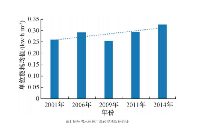 國(guó)內(nèi)對(duì)污水處理廠的運(yùn)行能耗指標(biāo)也有持續(xù)的統(tǒng)計(jì)。2001年編制《城鎮(zhèn)污水處理工程項(xiàng)目建設(shè)標(biāo)準(zhǔn)》(修訂)時(shí),對(duì)處理規(guī)模1萬(wàn)~100萬(wàn)m3/d的二級(jí)污水處理廠的運(yùn)行能耗進(jìn)行了調(diào)研,結(jié)果顯示污水處理廠的單位能耗分布在0.15~0.40 kW·h/m3區(qū)間,均值為0.26 kW·h/m3。2006年對(duì)全國(guó)559座污水處理廠運(yùn)行能耗調(diào)研的結(jié)果顯示單位能耗均值為0.290 kW·h/m3。2009年對(duì)全國(guó)559座污水處理廠運(yùn)行能耗調(diào)研的結(jié)果顯示單位能耗均值為0.254 kW·h/m3。2011年對(duì)全國(guó)1441座污水處理廠運(yùn)行能耗調(diào)研的結(jié)果顯示90%污水處理廠的單位能耗分布在0.157~0.471 kW·h/m3區(qū)間,均值為0.293 kW·h/m3。2014年對(duì)全國(guó)1 980座污水處理廠運(yùn)行能耗調(diào)研的結(jié)果顯示90%污水處理廠的單位能耗分布在0.094~0.462 kW·h/m3這一區(qū)間,均值為0.325 kW·h/m3。單位能耗指標(biāo)的變化趨勢(shì)如圖1所示。