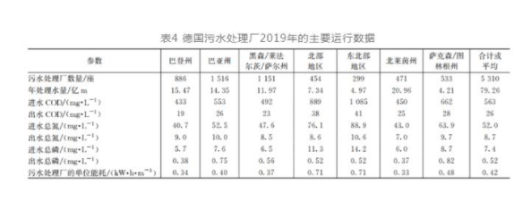 國(guó)內(nèi)污水處理廠的能耗水平與歐美發(fā)達(dá)國(guó)家相比究竟怎樣呢?國(guó)內(nèi)文獻(xiàn)中較多出現(xiàn)的觀點(diǎn)是國(guó)內(nèi)污水處理廠的能耗水平明顯高于歐美發(fā)達(dá)國(guó)家。但筆者認(rèn)為未必如此,污水處理廠的能耗水平與其建設(shè)標(biāo)準(zhǔn)和處理標(biāo)準(zhǔn)直接相關(guān),不是同一基礎(chǔ)上的數(shù)據(jù)不具有可比性。國(guó)內(nèi)污水處理廠經(jīng)歷近十年的逐次提標(biāo),目前的處理標(biāo)準(zhǔn)應(yīng)該已超過(guò)了很多歐美國(guó)家的污水處理廠。為滿足高標(biāo)準(zhǔn)的處理需求,近十年來(lái)也從國(guó)外引進(jìn)了大量的先進(jìn)技術(shù)和裝備,應(yīng)該說(shuō)目前行業(yè)內(nèi)國(guó)際上大多數(shù)先進(jìn)的工藝、技術(shù)和裝備在國(guó)內(nèi)都得到了廣泛的應(yīng)用。因此至少單純?cè)谖鬯幚韽S運(yùn)行能耗方面國(guó)內(nèi)并不比歐美發(fā)達(dá)國(guó)家差。唐建國(guó)在城建水業(yè)上介紹了德國(guó)2019年的污水處理情況,德國(guó)水協(xié)2019年調(diào)查了全德5 310座污水處理廠的情況,占德國(guó)污水處理總規(guī)模的87.2%。其中關(guān)于污水處理廠的主要運(yùn)行數(shù)據(jù)摘錄如表4所示。