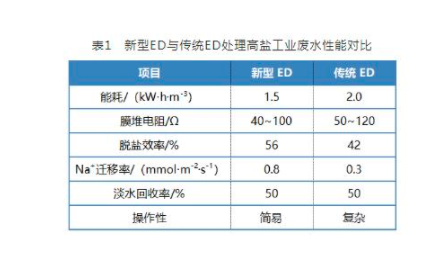 Qingbai CHEN等通過改變膜堆結(jié)構(gòu)(樹脂填充電極電池和不對稱膜對設(shè)計)并且優(yōu)化流入模式(電解質(zhì)平行流動和稀釋/濃縮逆流),降低了ED脫鹽過程的能耗。該新型ED與傳統(tǒng)ED對高鹽工業(yè)廢水進(jìn)行脫鹽的性能對比見表1。