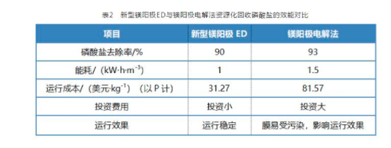Yuyan CAI等提出了一種新型鎂陽極ED,陽極氧化產(chǎn)生的鎂離子與高鹽工業(yè)廢水中的磷酸鹽和氨氮反應(yīng)生成鳥糞石沉淀,以實現(xiàn)資源化利用。新型鎂陽極ED與鎂陽極電解法從高鹽工業(yè)廢水中資源化回收磷酸鹽效能對比見表2。