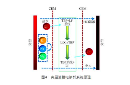 Zhongwei ZHAO等設(shè)計出一種結(jié)合液膜萃?。↙iquid Membrane Permeation,LMP)和ED特點的夾層液膜電滲析系統(tǒng),其原理見圖4,夾層液膜由2個CEM和1個負(fù)載Li+的有機(jī)液膜組成,其中有機(jī)液膜優(yōu)選為磷酸三丁酯(TBP)+ClO4-體系,這種夾層液膜電滲析法實現(xiàn)了從高M(jìn)g、Li質(zhì)量比鹽湖鹵水中選擇性回收Li。