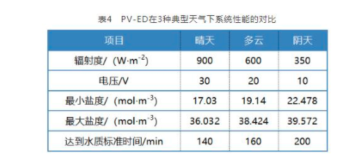 Haiyang XU等提出了一種小型光伏直接驅(qū)動電滲析系統(tǒng),探討了3種典型天氣對系統(tǒng)性能的影響,見表4,光伏組件提供的電壓受天氣影響,隨著輻射度的減小而減小,由此導(dǎo)致電場驅(qū)動力減小,出水達(dá)到水質(zhì)標(biāo)準(zhǔn)的時間變長。