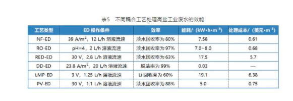 由于高鹽工業(yè)廢水中離子種類較多,ED與不同工藝耦合已成為研究熱點之一。結(jié)合實際情況,ED與不同工藝進(jìn)行耦合,在保證淡水回收率和資源回收率的同時,廢水處理成本也有所下降。部分耦合工藝處理高鹽工業(yè)廢水的效能對比見表5。