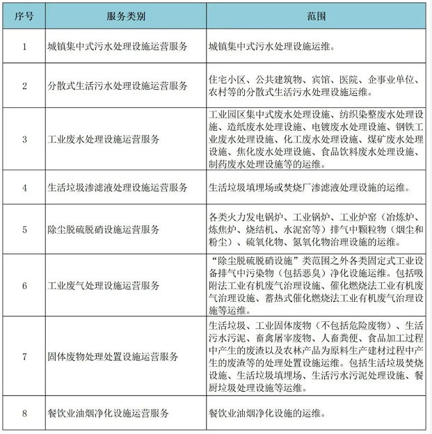 一、污染治理設(shè)施運行服務(wù)類別及范圍