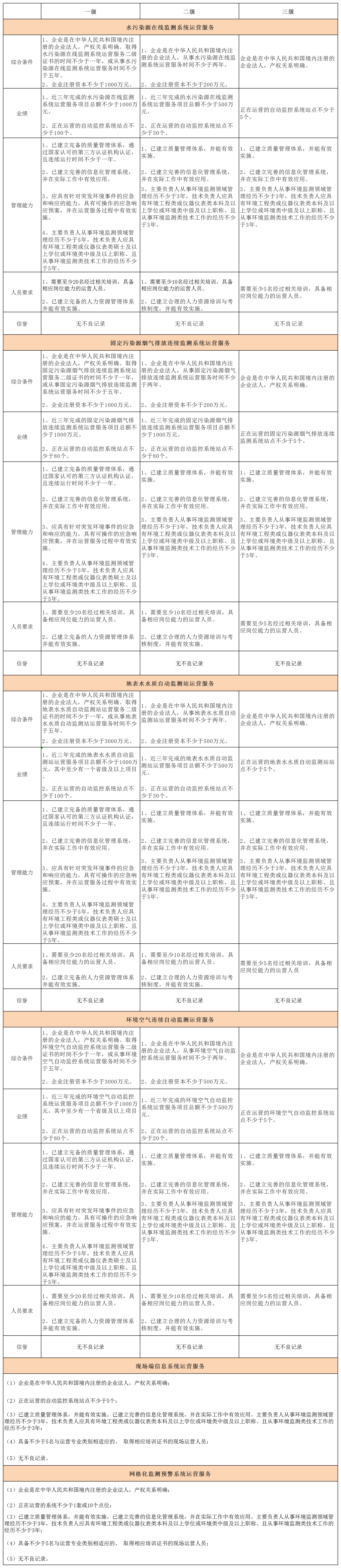 自動監(jiān)控系統(tǒng)運營服務認證按照服務類別劃分為三個等級,其中現(xiàn)場端信息系統(tǒng)運營服務、網格化監(jiān)測預警系統(tǒng)運營服務認證不分等級,詳見下表。