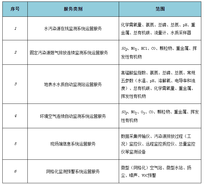 自動監(jiān)控系統(tǒng)運營服務認證包括水污染源在線監(jiān)測系統(tǒng)運營、固定污染源煙氣排放連續(xù)監(jiān)測系統(tǒng)運營、地表水水質自動監(jiān)測站運營、環(huán)境空氣連續(xù)自動監(jiān)測系統(tǒng)運營、現(xiàn)場端信息系統(tǒng)運營、網格化監(jiān)測預警系統(tǒng)運營服務等六個專業(yè)類別,詳見下表。