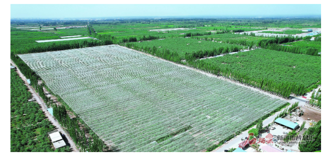 俯瞰阿克蘇市紅旗坡片區(qū)林海社區(qū)一片覆蓋防雹網(wǎng)的蘋果種植示范園(5月29日無人機拍攝)。 □石榴云/新疆日報記者 鄒懿攝